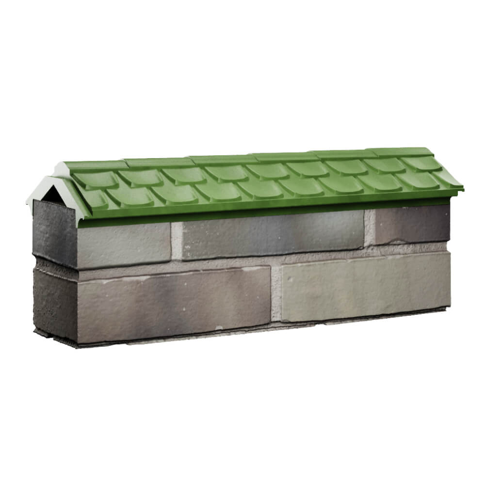 Парапет Elbrus Зеленый 175 х 510 х 65 мм с посадкой на 0.5 кирпича (130 мм) под натуральную черепицу может быть применен как в цокольной, так и в верхней части забора в виде конька.